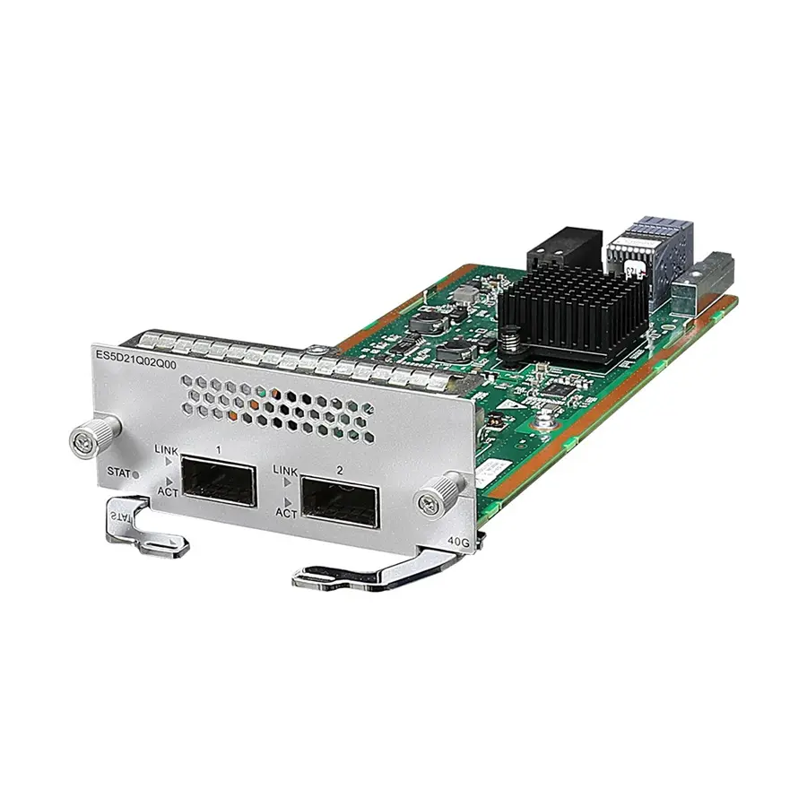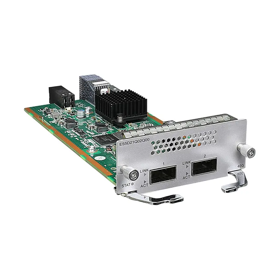 Both optical ports on the ES5D21Q02Q00 support only QSFP+ optical modules, QSFP+ AOC cables (10 m; QSFP+ to QSFP+ or QSFP+ to 4*SFP+), and QSFP+ copper cables (1 m, 3 m, and 5 m; QSFP+ to QSFP+ or QSFP+ to 4*SFP+).