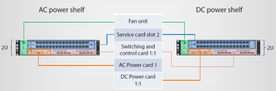 Supports 2* service slots, 2*switching and control slots, 1*AC power slot or 2*DC power slots
